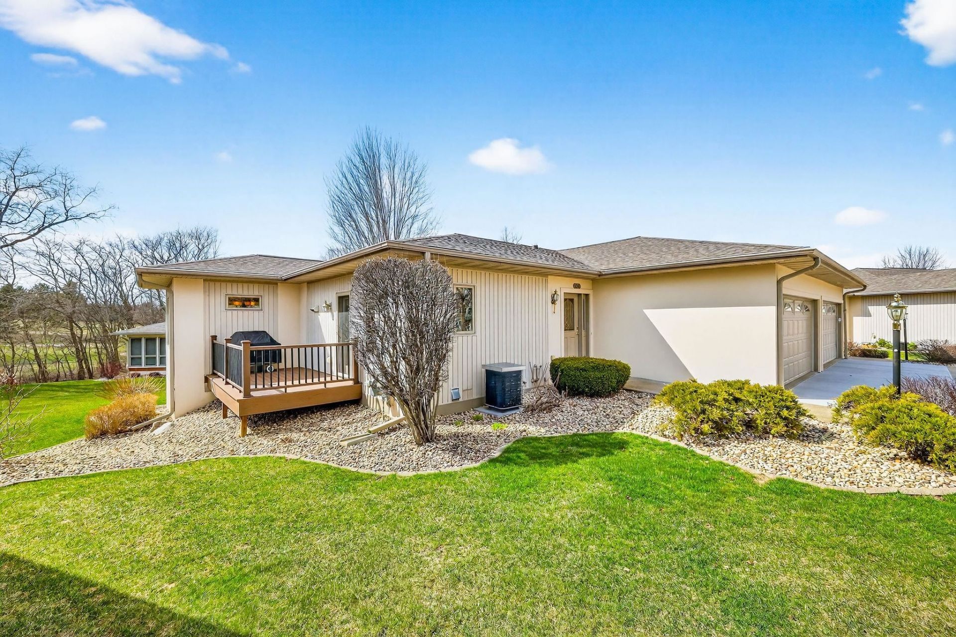 Welcome to Springbrook Drive, set on the golf course with west-facing sunset views offering a bright, open-concept main level filled with natural light. The spacious living and dining areas flow seamlessly into a well-appointed kitchen with abundant cabinetry and a dedicated laundry room and a maintenance-free deck with a built-in gas line. The main-level primary suite features an en-suite bathroom and walk-in closet, offering convenient one-level living. The finished lower level includes a second living area, full bathroom, and flexible layout with two bedrooms?or one bedroom and a private office as well as two large storage areas and attached two-car garage. Low-maintenance living with exterior upkeep and snow removal handled for you, all on a beautiful golf course setting.